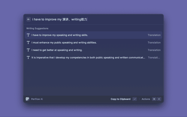 - This tool aims to encourage writing in English, allowing mixed Chinese-English input when needed, while providing completion, translation, and refinement capabilities to lower the barrier of native English writing