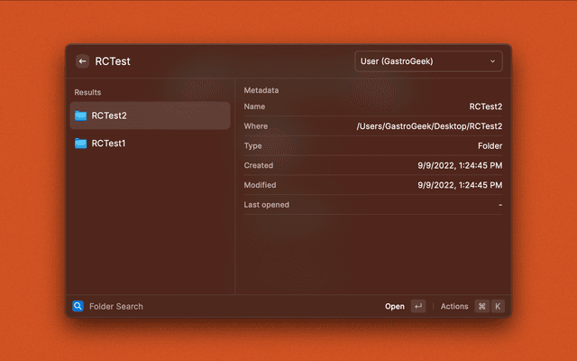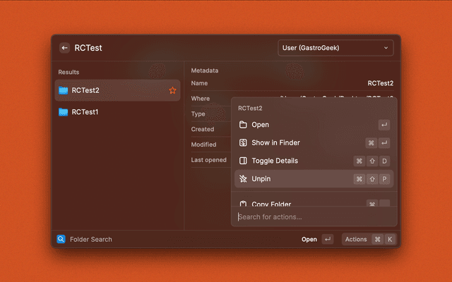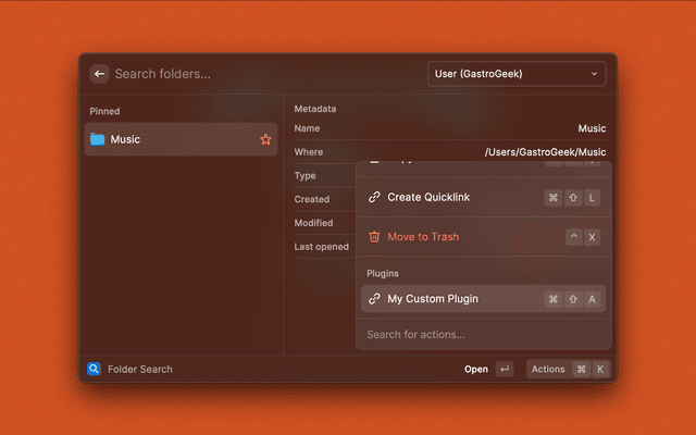 /)/path/to/plugins and /path/to/plugins/ work)/Users/<username>/Library/Application Support/Raycast/extensions/folder-search/plugins//path/to/your/folder-search/plugins/⌘ + ⌥ + ↑ - Navigate to enclosing folder⌘ + ⌥ + ↓ - Enter selected folder⌘ + . - Copy folder⌘ + ⇧ + . - Copy folder name⌘ + ⇧ + , - Copy folder path⌘ + ⇧ + L - Create quicklink⌘ + ⇧ + P - Toggle pin status⌘ + ⇧ + D - Toggle details view⌘ + ⇧ + S - Move Finder selection to folder⌘ + O - Open with...⌃ + X - Move to Trash