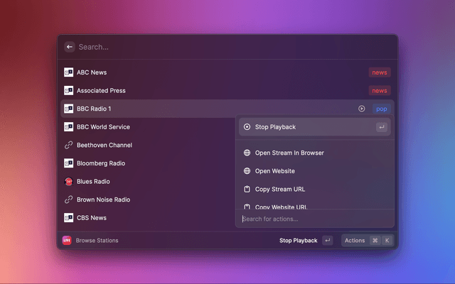 Play live internet radio through Music, QuickTime Player, VLC, or Vox. The 36 default stations cover a wide variety of genres, including live news, and you can add custom stations by providing a directly link to the stream URL (e.g. a live broadcast mp3, ogg, acc, pls, or other audio file). You can also view the current station and control playback via a menu bar extra.