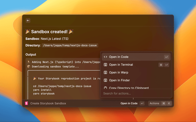 Create new Storybook sandboxes locally, or online in StackBlitz