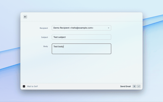 • Prompts for subject and body inside a Raycast form so nothing breaks your flow.