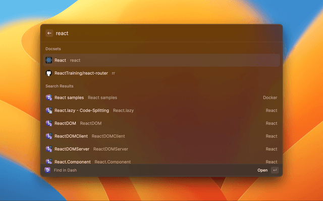 Interface with the Dash application, allowing users to quickly search through documentation sets