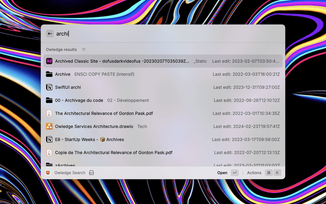 Access Notion, Figma, Github, Miro, Jira and way more in a single crazy fast search. | Set your Owledge workspace at: https://search.owledge.app | Documentation available at: https://owledge.notion.site/Use-Raycast-s-extension-75b90b8501014bb7b8c8c901a9fcc552?pvs=74