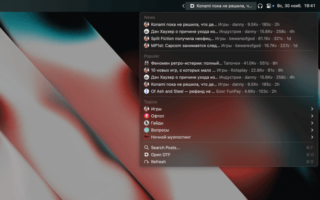 The extension uses the public DTF API (Osnova platform):