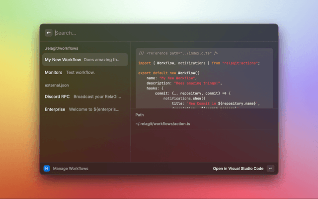 The RelaGit extension for raycast allows you to view and search your RelaGit repositories, and manage your RelaGit workflows.