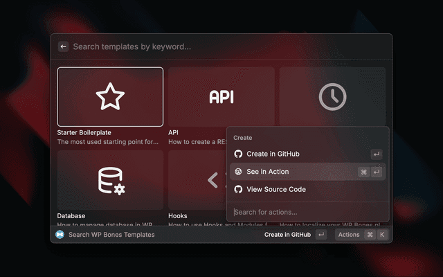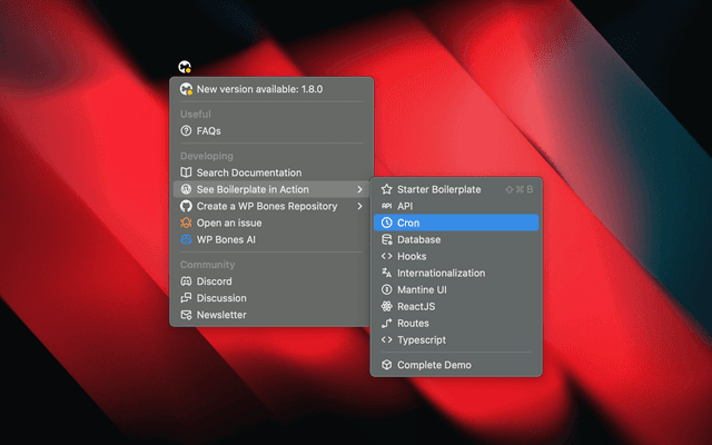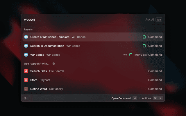 This mod provides several commands centered around managing the WP Bones WordPress plugin framework. It provides quite a few commands for varying uses, so there should be something for everyone! Take a look at the scenarios below to get a feel for how you might use the extension.