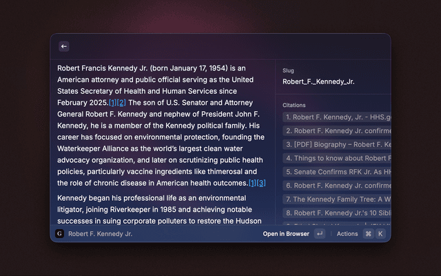 Tired of reading news written by people with a bias? Find articles of information about a given topic from Grokipedia, a bias-free encyclopedia powered by AI. It is available now on Raycast, with all functionality from the webpage, grokipedia.com!
