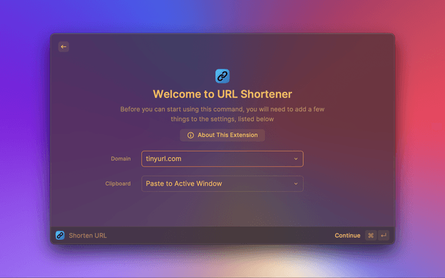 Experience the joy of shortening URLs to your heart's desire with Raycast's URL Shortener! Enjoy the convenience of free URL shortening, without the need for an API key or any rate limits. The domains you can use are: tinyurl.com, shrtco.de, 9qr.de, and shiny.link