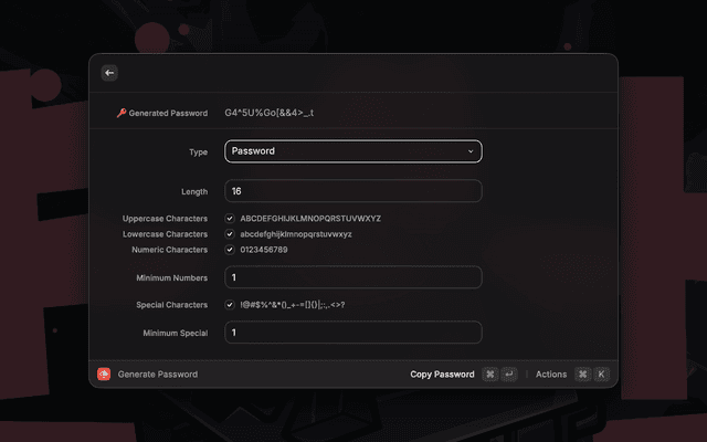 Generate secure passwords with customizable options: