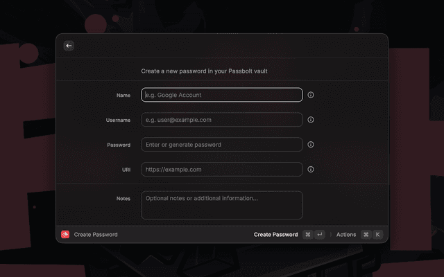 Create new password entries in your Passbolt vault with an intuitive form interface. Supports: