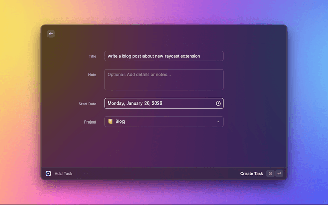 - Create Tasks: Quickly add new tasks with title, notes, priority, dates, and project assignment