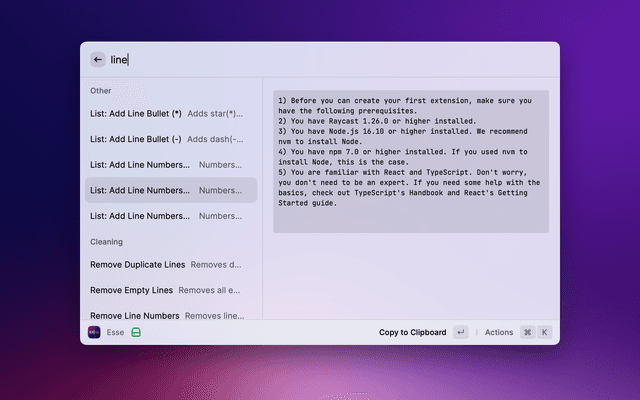 When run, this extension reads the text on the clipboard, then presents a list of Esse's actions for you to choose from. After choosing an action, the transformed text is written back to the clipboard.