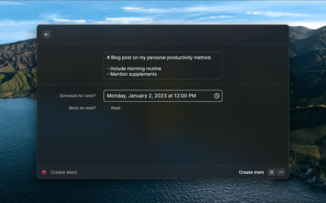 Access Mem functionality through Raycast using the Mem API. The Mem API is still growing and is currently very limited.