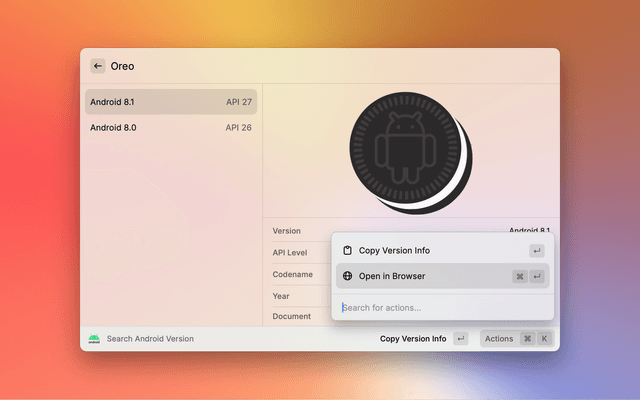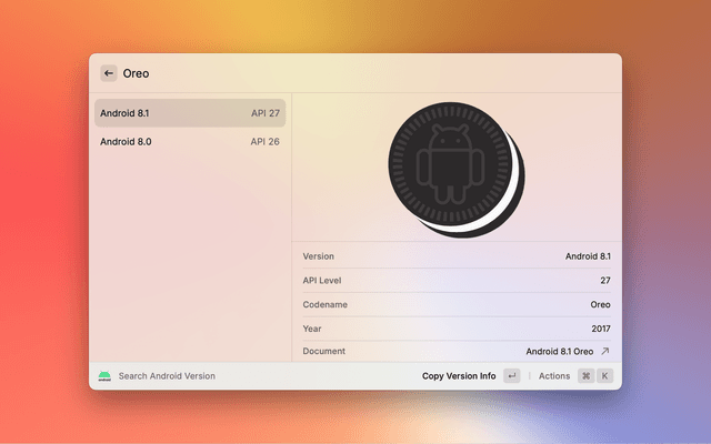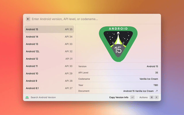 Search quickly between Android version number, API level, codename.
