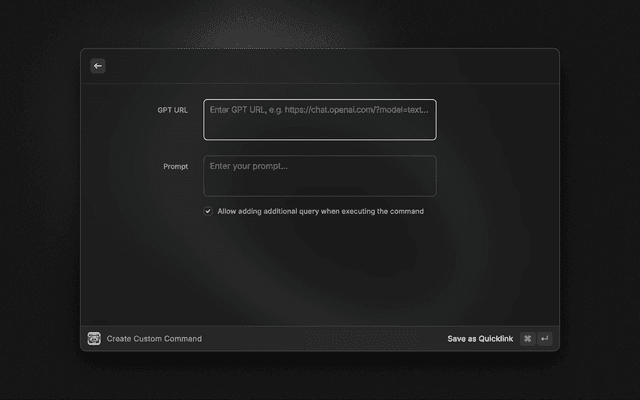 Open ChatGPT in the browser from raycast with your custom prompt and specific query. The extension leverages AppleScript to open a URL and execute JavaScript within a browser tab, automating the process of inserting your prompt and query, and then pressing the submit button. You can create multiple custom commands to open specific GPT versions or to open existing chats, using your custom prompt and an additional query that you provide on the fly while running the command.