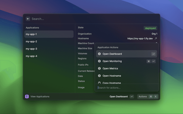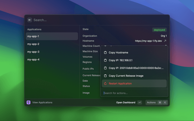 This extension allows you to list all the Fly.io applications you have access to, view their details and do a number of keyboard only operations, such as: