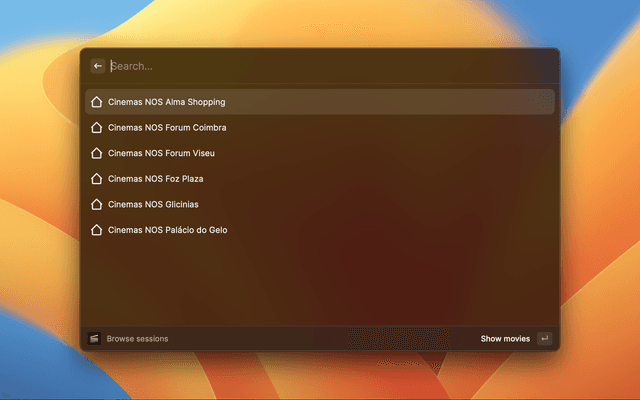 Shows all movies and schedules in display by Cinemas NOS.