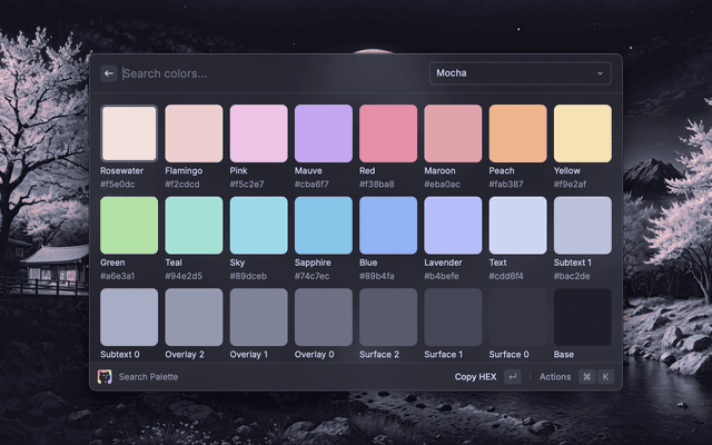 Catppuccin has hundreds of ports (such as the Catppuccin for Raycast port), covering a wide range of applications, tools, websites, and just about anything you can imagine!