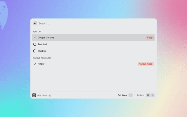 This extention offers users the ability to manage currently running applications, with options to choose which apps to keep open and which to close during cleanup. It's especially suited for users looking to optimize their work environment and increase productivity. Users can set apps to “Always Keep,” ensuring they aren't closed during cleanup operations. The extension also provides an intuitive interface to add or remove apps from the preset keep list and features a one-click function to close non-kept apps.