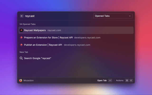 Search and open Mozilla Firefox tabs from search query, opened tabs, recently-closed tabs, and bookmarks.