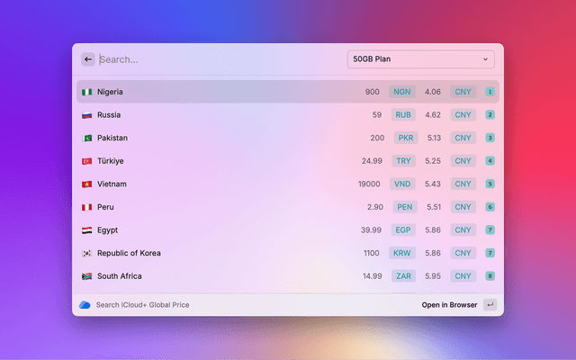 iCloud+ offers various global pricing tiers for storage plans, including 50GB, 200GB, 2TB, 6TB, and 12TB, with prices varying by region and currency.