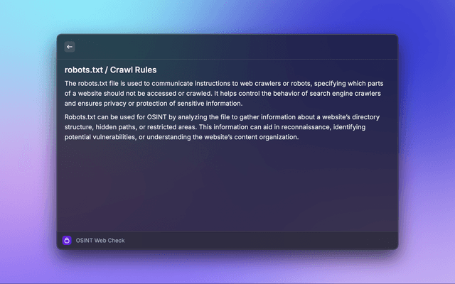 The OSINT Web Check extension is an extension to deploy some OSINT (Open Source Intelligence) checks against a provided URL, inspired by web-check by Lissy93.