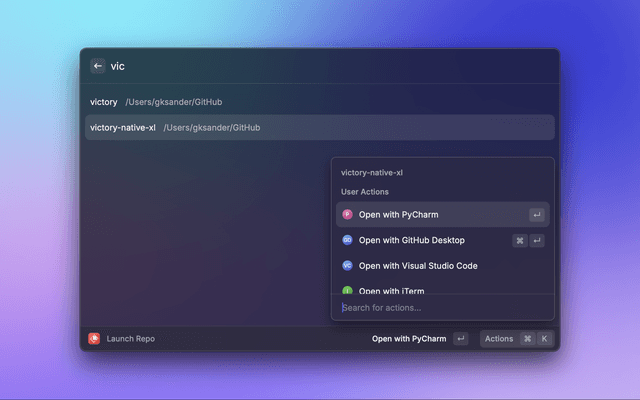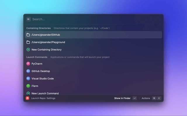 Once you've found the project you want to launch, press Enter to launch it in the first application in your "Launch Commands" list from the settings view. Or press Cmd + K to select a different application to launch it in.