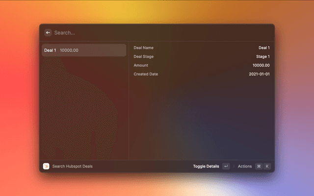 Disclaimer: This is not an official HubSpot product. It is a raycast plugin created by a third party and may not accurately reflect the features and capabilities of HubSpot products. Please refer to the official HubSpot website for accurate and up-to-date product information.