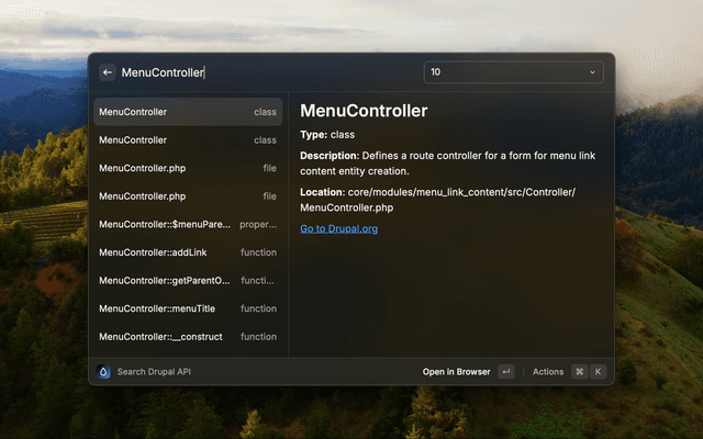 This command lets you search in Drupal's API. It will return the first 50 items from api.drupal.org based on your search text. You can open a specific item in your browser by pressing Enter. Further actions like copying Drupal core's location are also available.