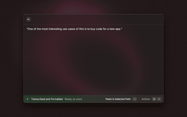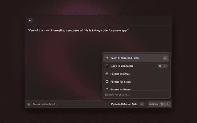 - Press Enter to stop and transcribe, or select a specific format (Email, Slack, Report)