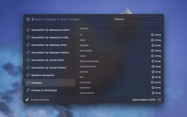 Browse datasets functionality. Command that allows the look up of the schemas of all the datasets available in Open Targets. Their location in the Google Cloud Storage is copied to the clipboard.
