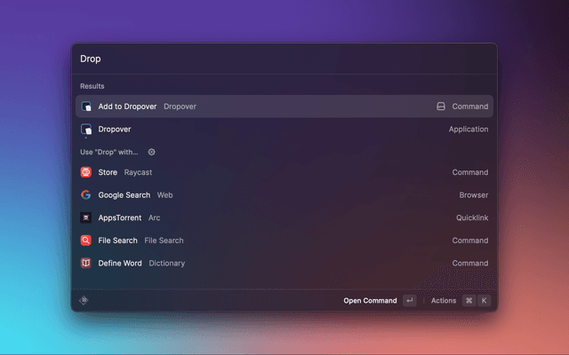 Add selected files to Dropover with a single click from Raycast.