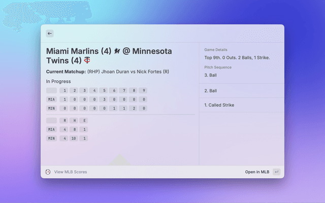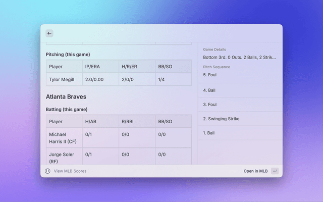 Get the latest scores for MLB games from the official MLB API. Show total scores, inning, latest play, as well as overall box scores for both hitting and pitching.