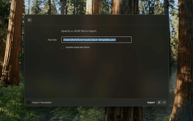 Create Slack TemplateDaily Report){date} - Current date (YYYY-MM-DD){time} - Current time (HH:MM){user} - Your Slack usernameSend Slack Message⌘ + E to edit or ⌃ + X to delete the selected templateExport Templates~/Downloads/slack-templates.jsonImport Templates
