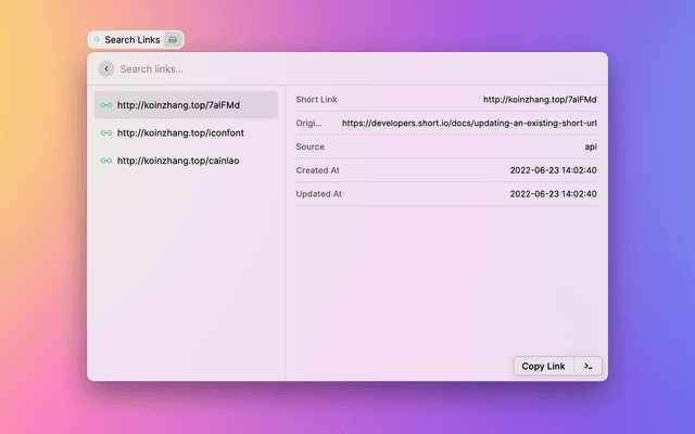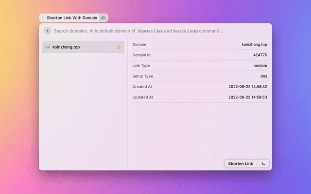 You can set default domain for Shorten Link and Search Links commands via the Shorten Link With Domain command (action: Set Default Domain, shortcut: Cmd+Enter).