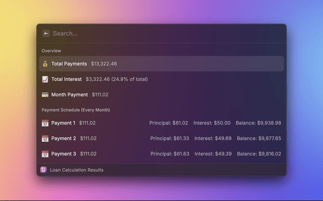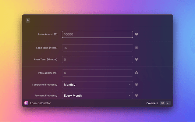 A comprehensive loan calculator extension for Raycast that helps you calculate loan payments with customizable terms and payment schedules.