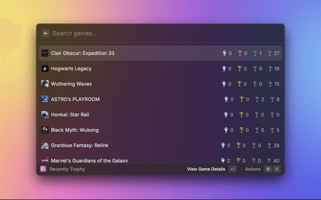 A Raycast extension that allows you to access your PlayStation Network profile, view recently played games, and track your trophy progress directly from Raycast.