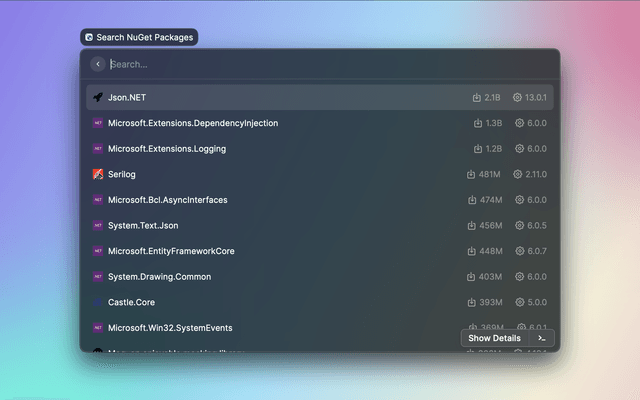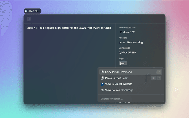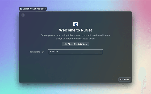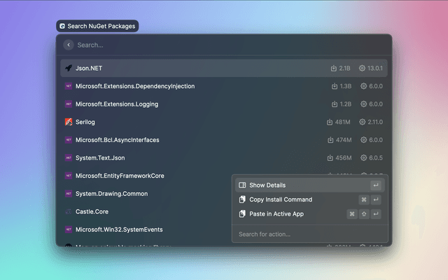 This extension let you search for a NuGet package, view its details and quickly copy the command to install it to the clipboard.