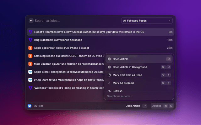 My Feed (Articles command): browse feed articles with fast keyboard actions.Saved Articles: view saved articles.Sources: browse followed sources and manage VIP/non-VIP status.Executive Summary: generate an AI executive brief from your unread feed items.Save).Mark This Item as Read).Mark All as Read).AI Summary).Executive Summary).Sources: