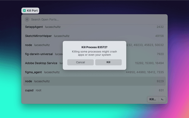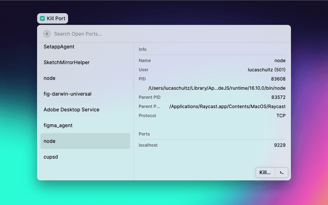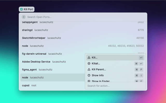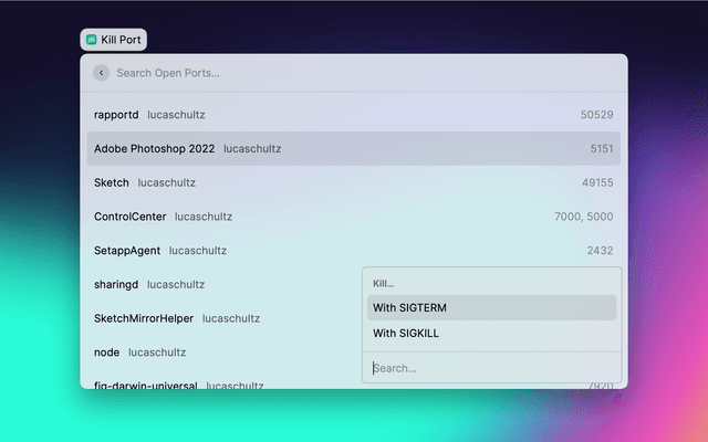 List open ports in Raycast and the menu bar, and kill the processes associated with these ports. Choose between two termination signals: the default SIGTERM signal or the SIGKILL signal, which cannot be ignored by the process.
