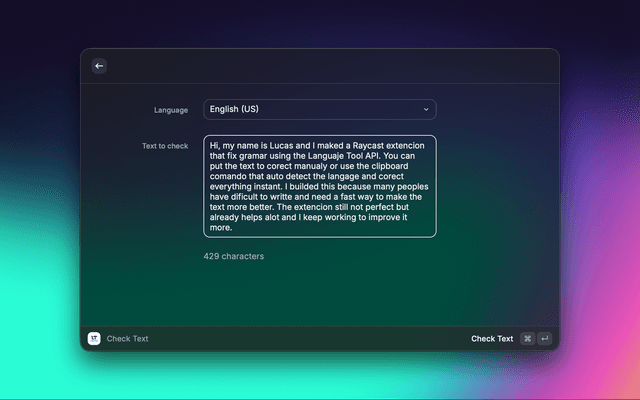 Instant spelling and grammar correction using LanguageTool API. Get real-time suggestions and improve your text quality in multiple languages.