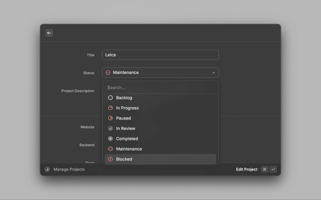 The Project Companion Raycast Extension allows you to manage your projects directly from Raycast. Use it to store project information like name, description, status, and links.