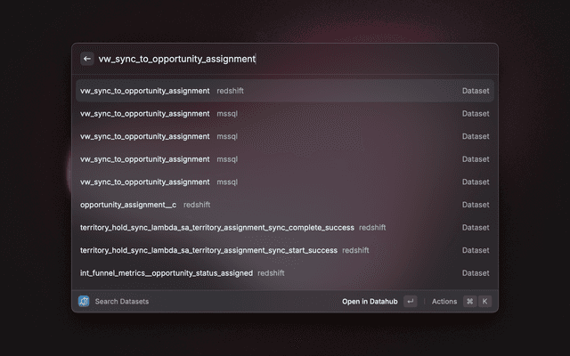 Search and explore datasets in your DataHub data catalog directly from Raycast.
