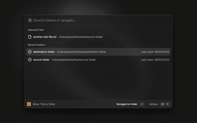 mdfind)Enter: Navigate to the selected folderCmd+Return: Move files to the selected folderCmd+Shift+Return: Copy files to the selected folderCmd+Shift+D: Toggle details viewCmd+Shift+P: Pin/Unpin folderCmd+Shift+R: Remove folder from recent history[!IMPORTANT] this extension is not available yet in the Raycast store. You can see the ticket here, so if you want to see it in the store, you can upvote it or smth. in the meantime, you can install it manually.