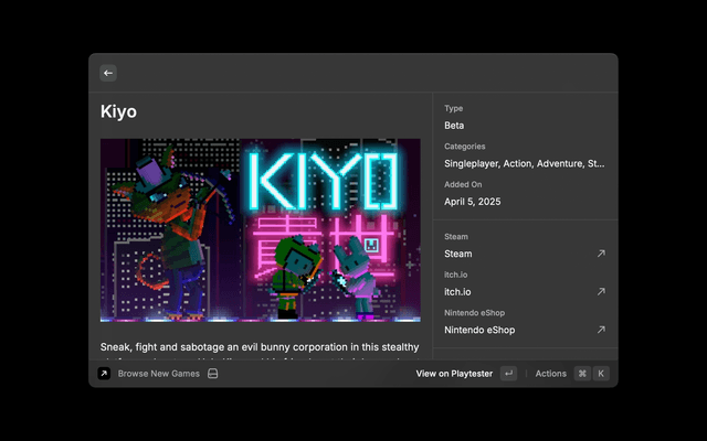 This Raycast extension provides quick and convenient access to Playtester’s database of indie games right from your desktop.