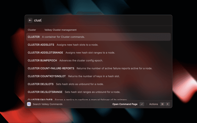 The extension provides easy to access searchable list of Valkey commands. On selecting a command the extension opens the command's documentation on Valkey website.