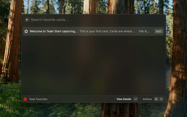Quick Save: Save text or URLs to Teak without context switching.Search Cards: Search across Teak card content, tags, and metadata.Favorites: Open and copy from your favorited cards.https://app.teakvault.com/settingsapp.teakvault.com and Convex endpoints.