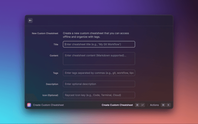 Access a curated collection of DevHints cheatsheets plus the ability to create and manage your own custom sheets - all without leaving your keyboard. You can also import Markdown cheatsheets directly from your GitHub repositories and keep them up to date via a built-in Repository Manager. Search is smart and fast, prioritising titles over content so you find what you need instantly.
