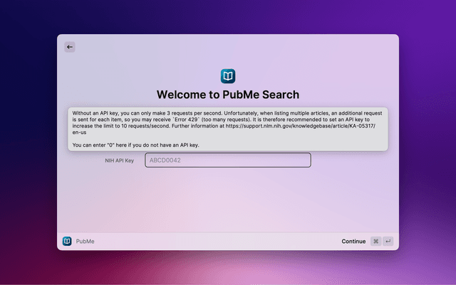 Required NIH API Key (enter "0", if you do not have one): Without an API key, you can only make 3 requests per second. Unfortunately, when listing multiple items, an additional request is sent for each item, so you may receive the error message "Error 429" (too many requests). It is therefore recommended to set an API key to increase the limit to 10 requests/second. Further information at https://support.nlm.nih.gov/knowledgebase/article/KA-05317/en-us