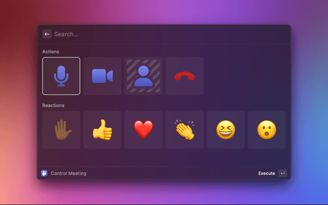 With this Raycast extension you can control a Microsoft Teams Meeting using your keyboard – no matter whether Microsoft Teams is currently the focused app or not. You can also define global hotkeys to toggle microphone and camera.